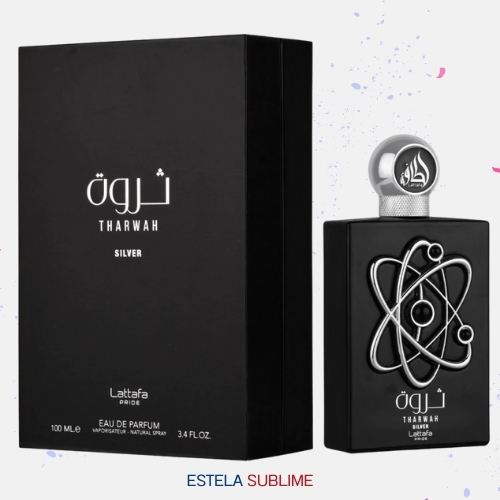 THARWAH SILVER DE LATTAFA PERFUMES ES UNA FRAGANCIA DE LA FAMILIA OLFATIVA AMADERADA ACUÁTICA PARA HOMBRES. ESTA FRAGANCIA ES NUEVA. THARWAH SILVER SE LANZÓ EN 2022. LAS NOTAS DE SALIDA SON MENTA Y BERGAMOTA; LAS NOTAS DE CORAZÓN SON ESCLAREA Y LAVANDA; LAS NOTAS DE FONDO SON ALMIZCLE, VETIVER Y CEDRO.