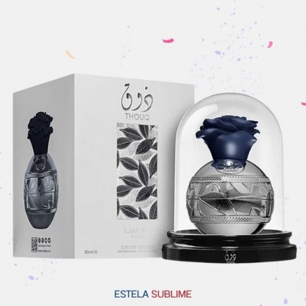 THOUQ DE LATTAFA PERFUMES ES UNA FRAGANCIA DE LA FAMILIA OLFATIVA FLORAL PARA HOMBRES Y MUJERES. ESTA FRAGANCIA ES NUEVA. THOUQ SE LANZÓ EN 2022. LAS NOTAS DE SALIDA SON LICHI Y BERGAMOTA; LAS NOTAS DE CORAZÓN SON ROSA Y INCIENSO; LAS NOTAS DE FONDO SON ÁMBAR Y VETIVER.