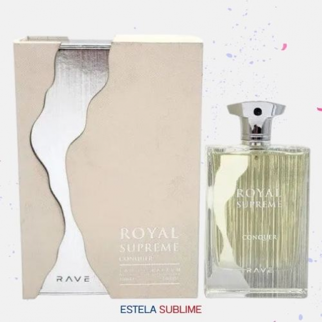 RAVE ROYAL SUPREME CONQUER DE LATTAFA PERFUMES ES UNA FRAGANCIA DE LA FAMILIA OLFATIVA AMADERADA AROMÁTICA PARA HOMBRES. ESTA FRAGANCIA ES NUEVA. RAVE ROYAL SUPREME CONQUER SE LANZÓ EN 2024. LA NOTA DE SALIDA ES BERGAMOTA; LAS NOTAS DE CORAZÓN SON MANDARINA, LIMÓN (LIMA ÁCIDA) Y TORONJA (POMELO); LAS NOTAS DE FONDO SON MADERA DE OUD Y ALMIZCLE.