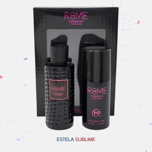 1-EAU DE PARFUM 100 ML 1-DESODORANTE 150 ML ROME EXTRADOSE POUR HOMME, UNA COMPOSICIÓN AUDAZ Y REFINADA, EXPRESA LA MASCULINIDAD MODERNA CON UNA FRESCURA VIBRANTE Y UNA PROFUNDIDAD SUTIL. LOS CÍTRICOS BRILLANTES ABREN LA FRAGANCIA ANTES DE DESPLEGARSE EN FRUTAS VERDES FRESCAS Y DELICADAS NOTAS FLORALES, ASENTÁNDOSE EN UNA BASE CÁLIDA Y TEXTURIZADA DE MADERAS Y ÁMBAR GRIS. NOTAS DE SALIDA: BERGAMOTA Y LIMÓN NOTAS DE CORAZÓN: HOJA DE HIGUERA, MUSGO BLANCO, JAZMÍN Y MANZANA VERDE NOTAS DE FONDO: CAPRILOILO, MADERA DE GUAYACO, SÁNDALO Y ÁMBAR GRIS
